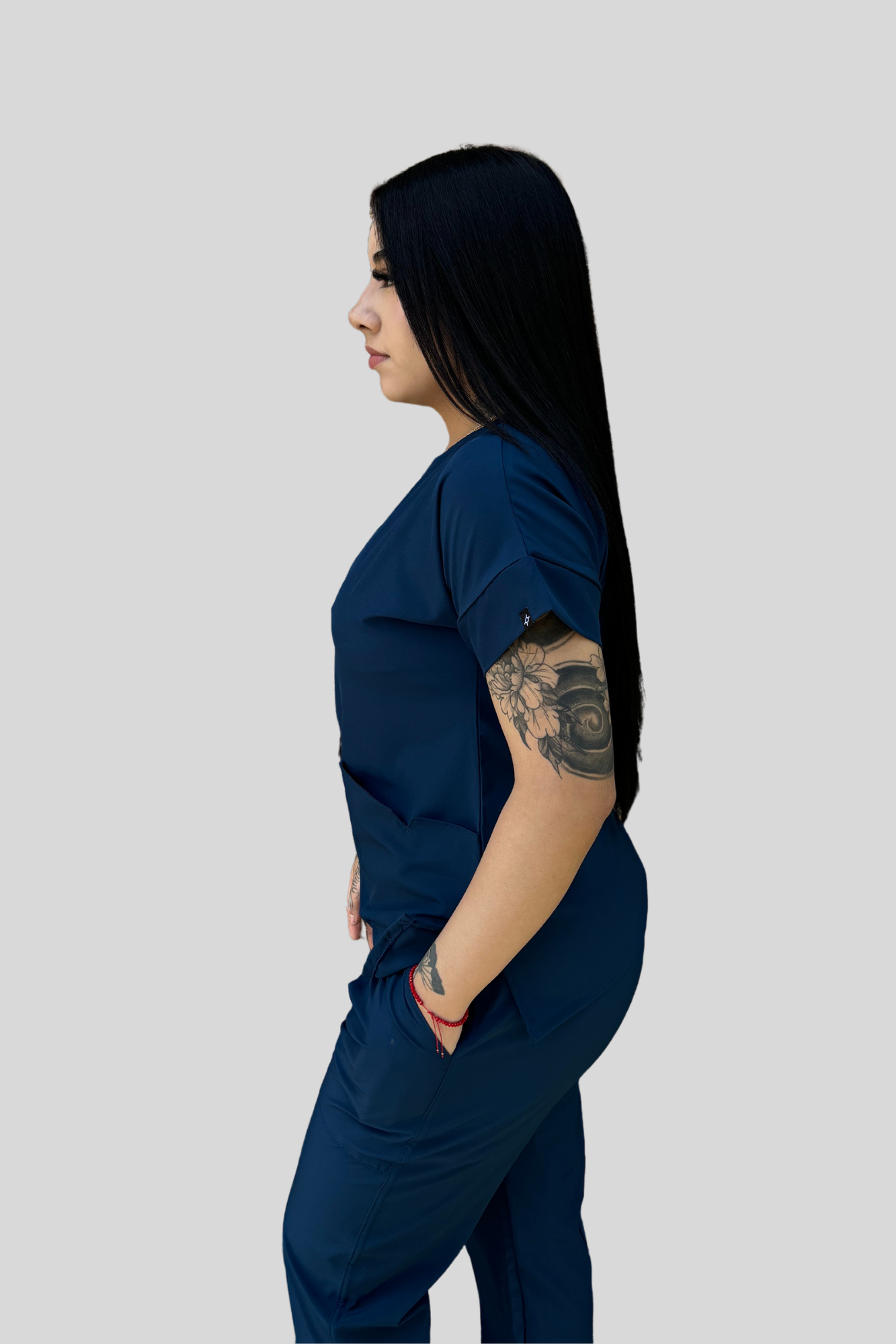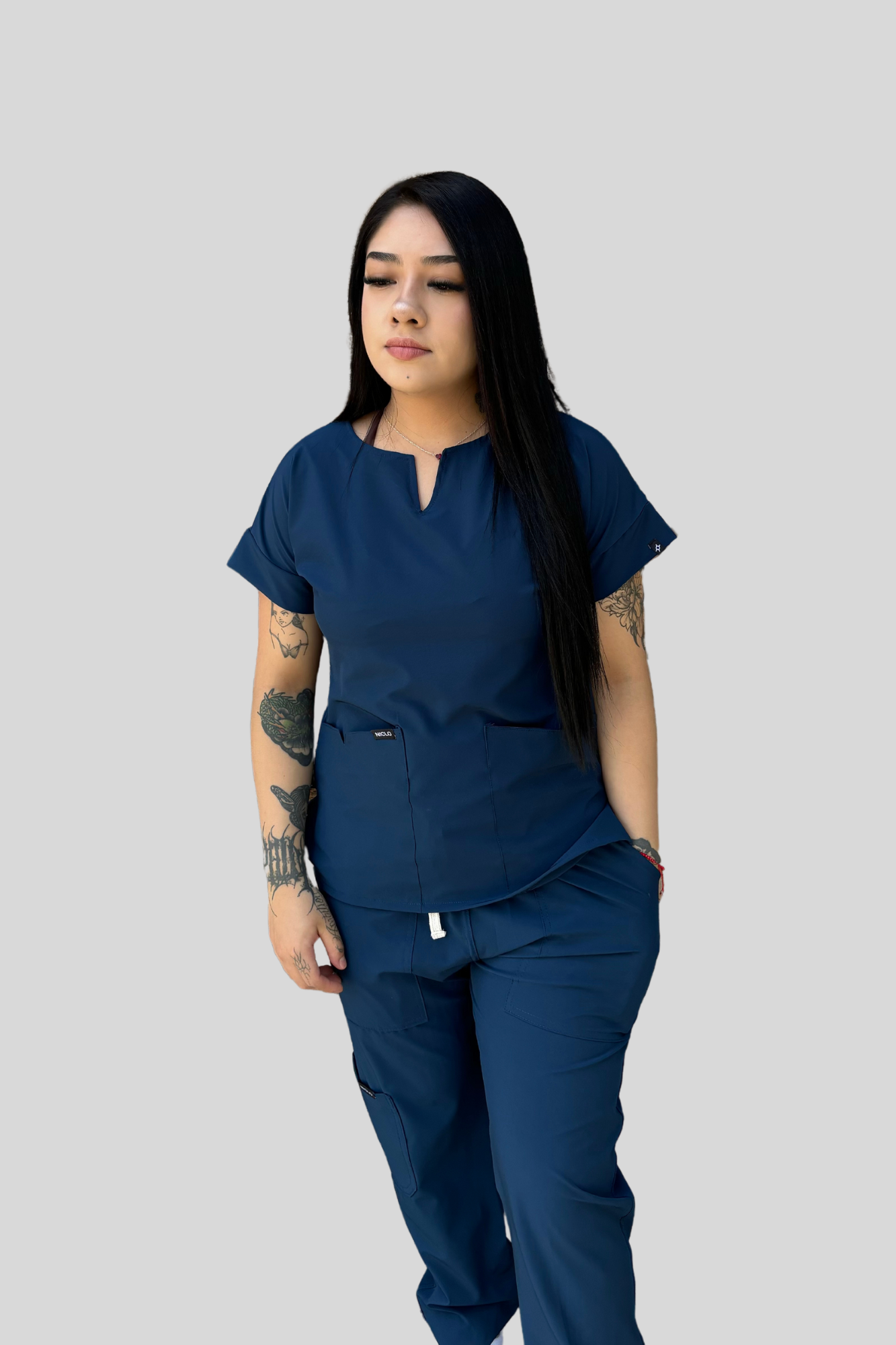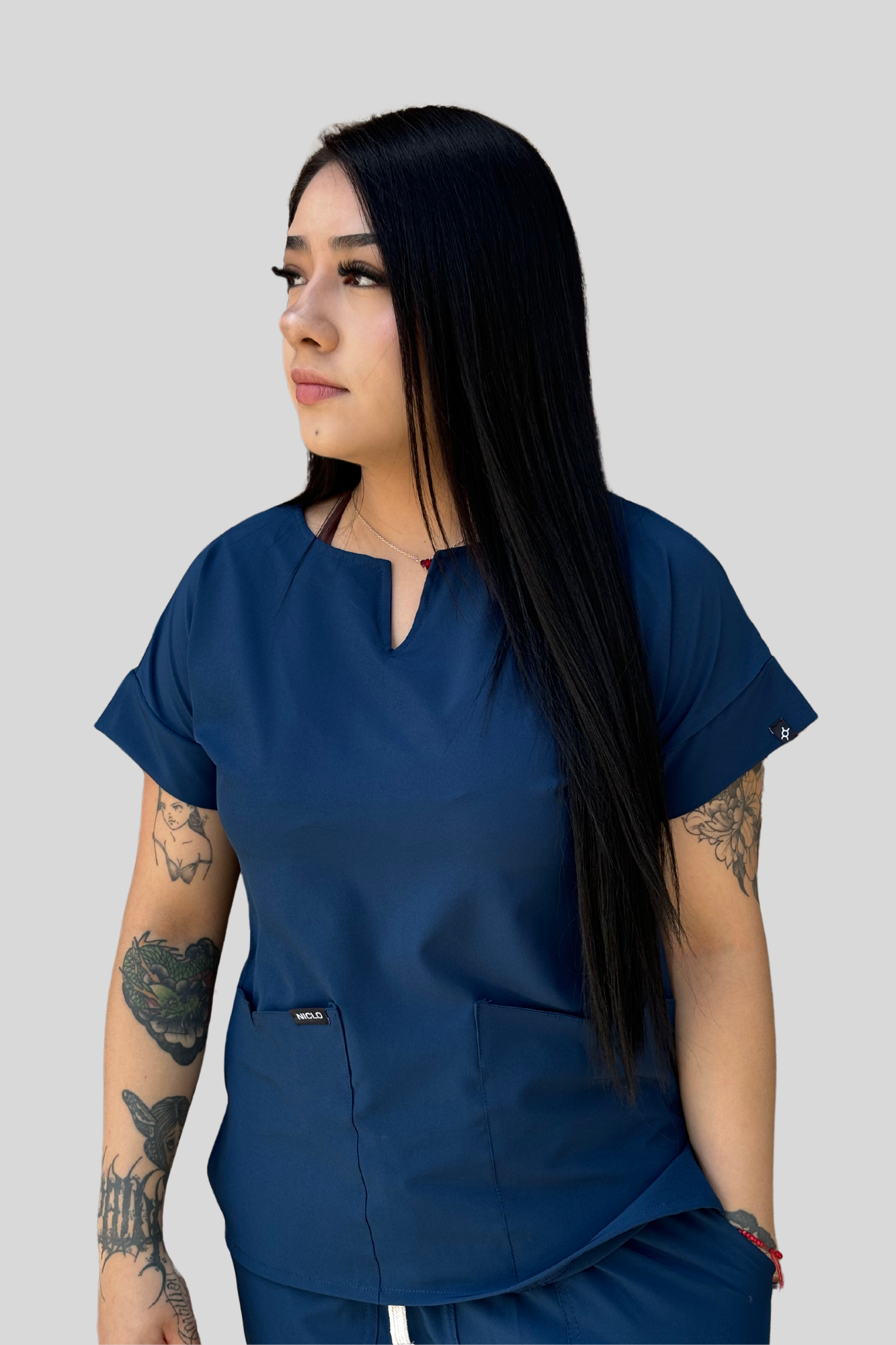 FILIPINA: Corte asiluetado, escote tipo chick V, manga corta y 2 bolsas laterales
